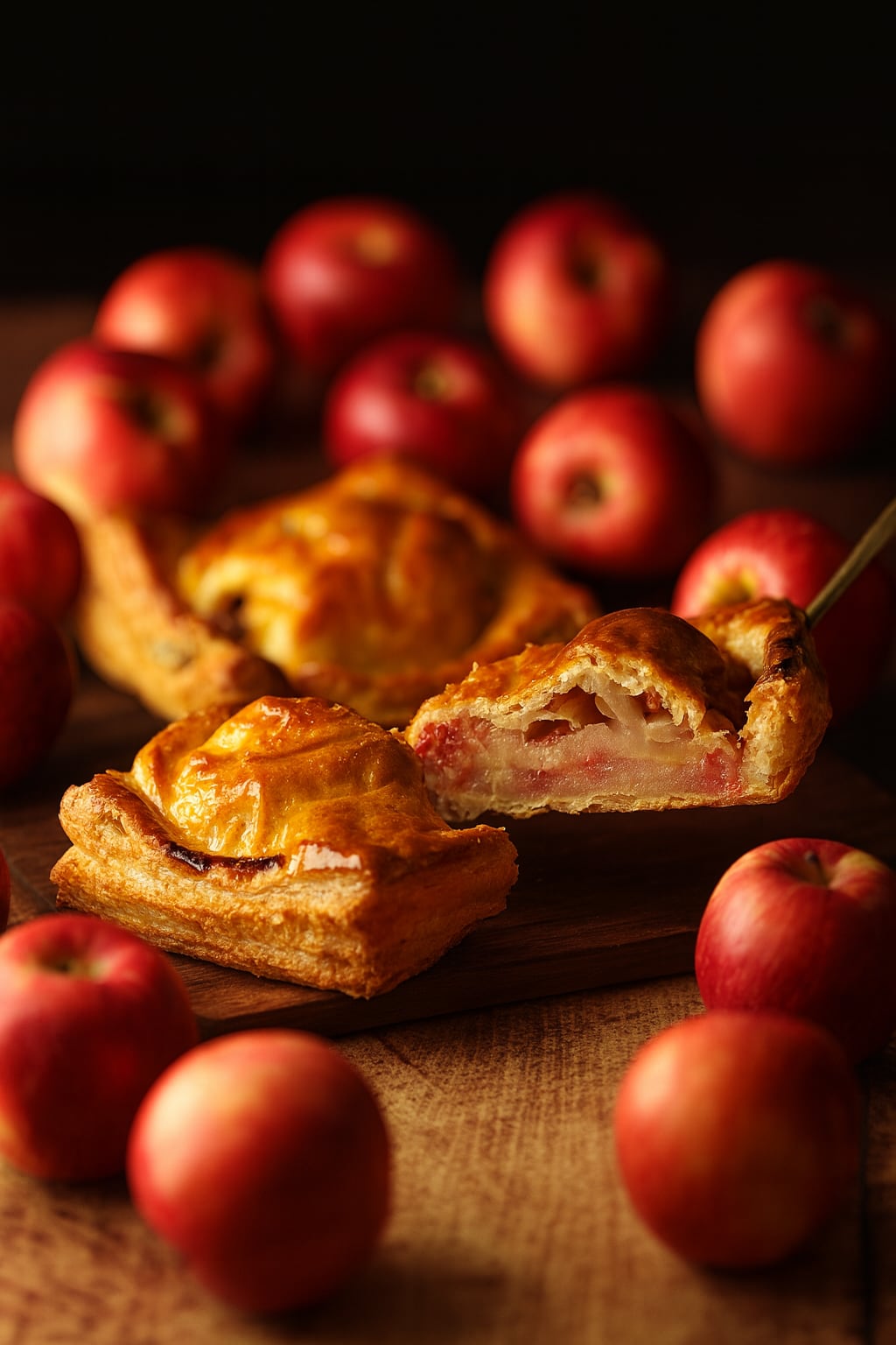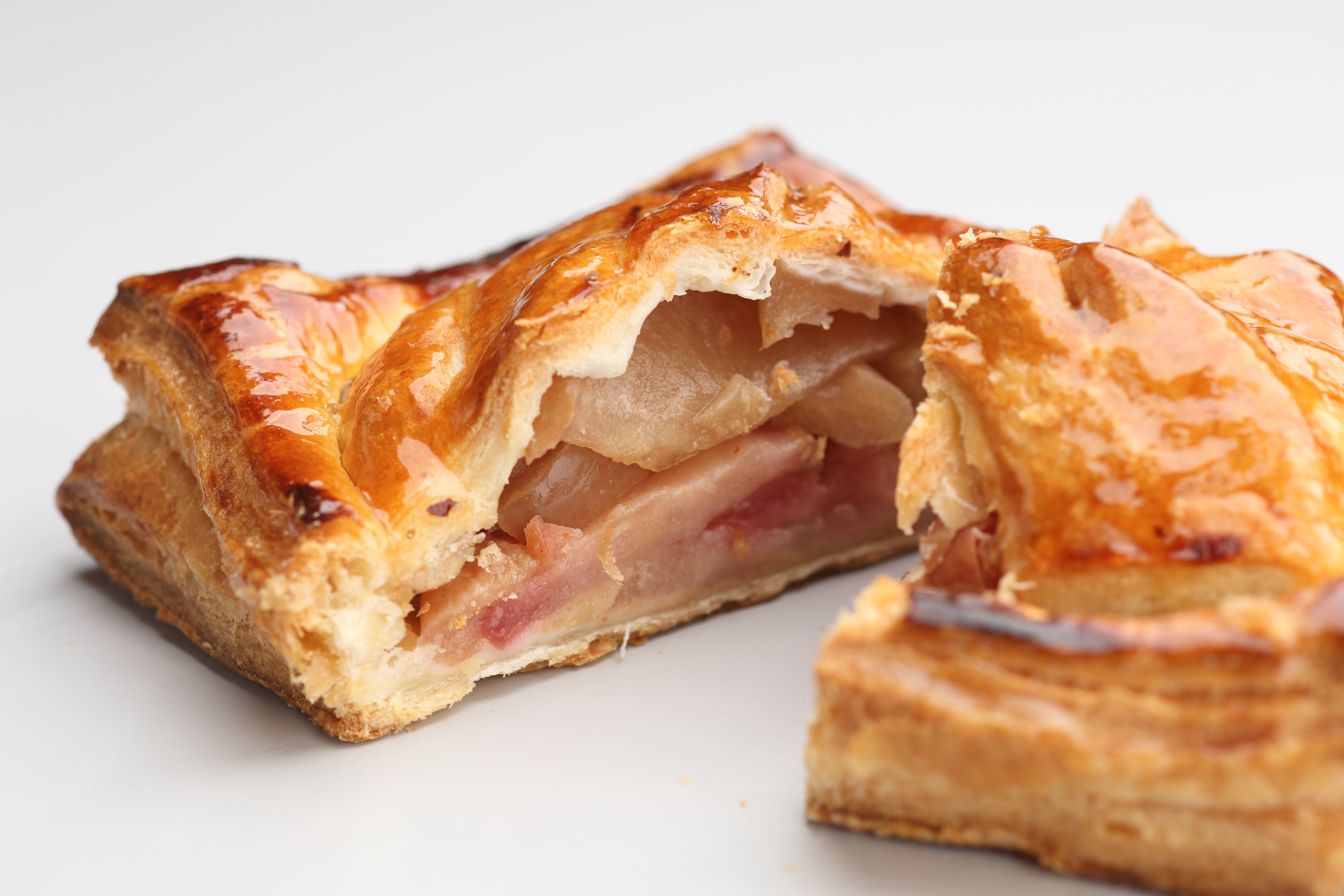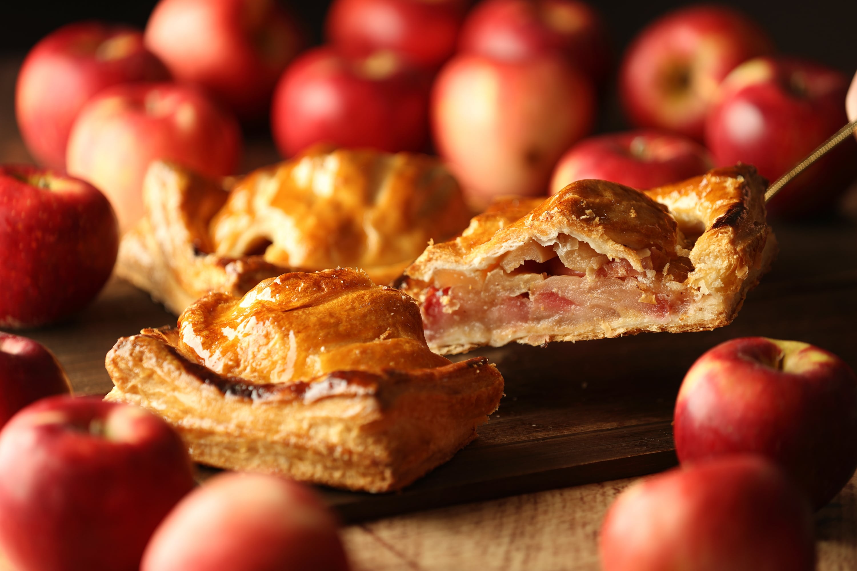 手折りで144層まで折り込んでいるため、仕上がりは、サクッと軽い食感ですぐにほどけ、口の中でりんごへとつながる一体感のあるパイ。